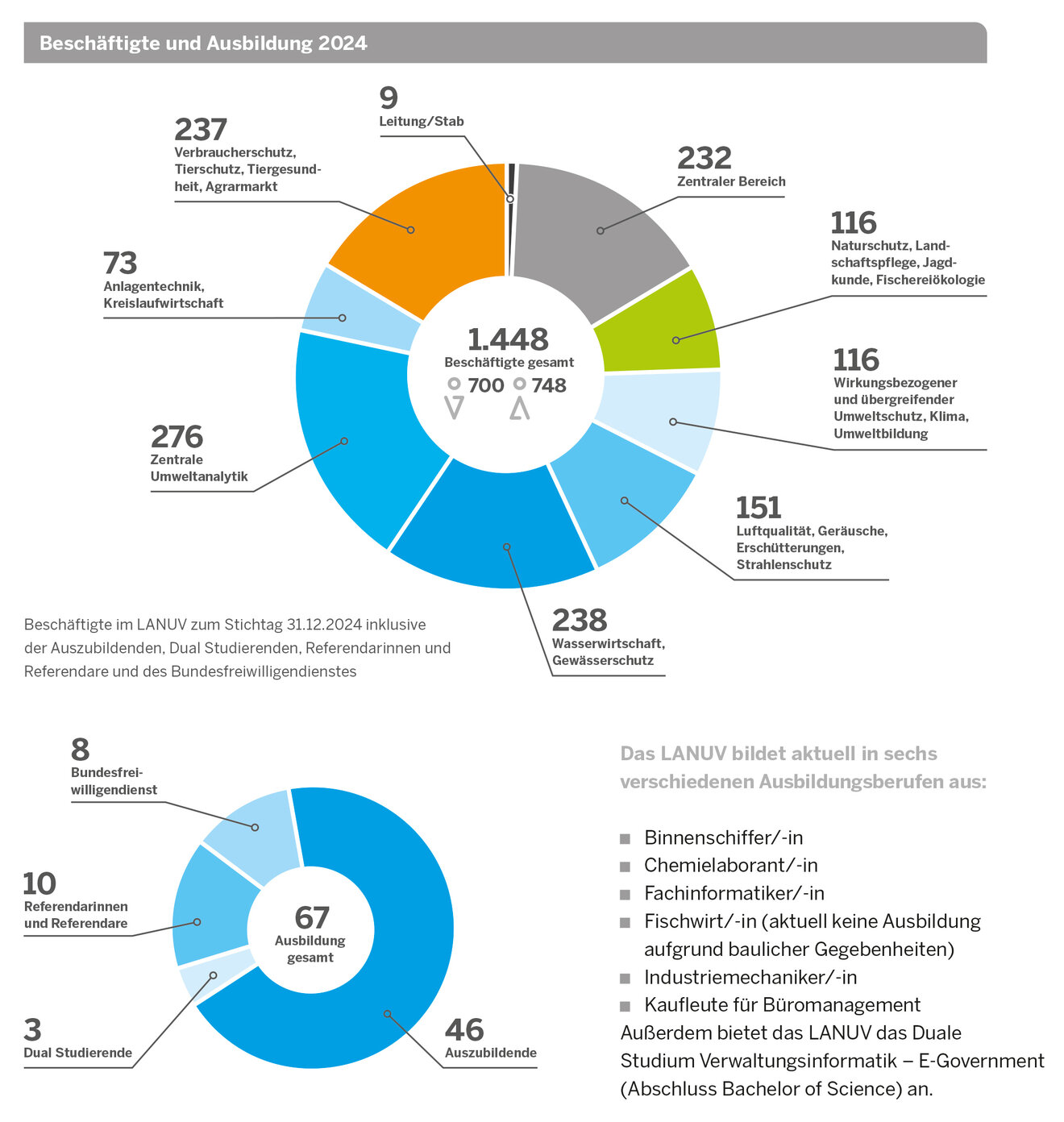 Das LANUV beschäftigt 42 Lebensmittelkontrolleurinnen und -kontrolleure und amtliche Kontrollassistentinnen und -assistenten. Sie arbeiten unterstützend in den Lebensmittelüberwachungsämtern der Kreise und kreisfreien Städte. Weiterhin gehören 25 Lebensmittelchemiepraktikantinnen und -praktikanten zu den LANUV-Beschäftigten, die in externen Unternehmen eingesetzt werden.