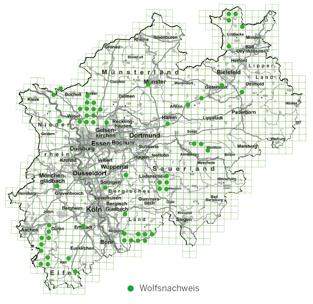 In NRW sind derzeit vier Rudel im Nationalpark Eifel, im Märkischen Kreis sowie im Westmünsterland und im Rhein-Sieg-Kreis nachgewiesen, dazu kommen drei territorial lebende Wölfe in der Senne, im Oberen Arnsberger Wald und in der Rur-Eifel. Aus Belgien und Niedersachsen tauchen in NRW immer wieder Wölfe auf, die durchziehen. Der Wolf ist also da und wird aus NRW nicht mehr verschwinden.