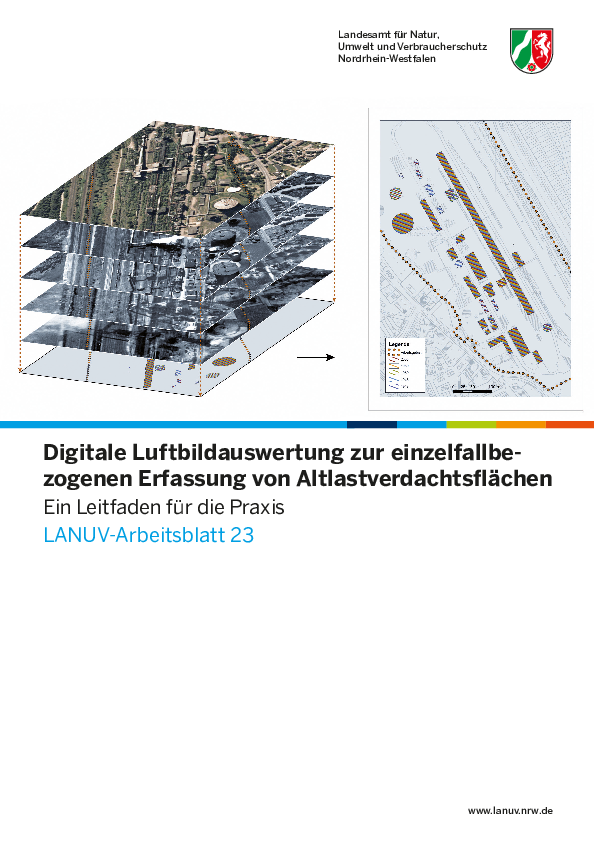 Im Leitfaden werden die Entstehung, Verfügbarkeit und Auswahl von digitalen Luftbildern für die Verdachtsflächenerfassung und Methoden und Techniken der digitalen Vorverarbeitung beschrieben. Anhand von Beispielen wird die systematische Vorgehensweise bei der Durchführung der digitalen Luftbildauswertung in der Erfassungspraxis dargestellt.
