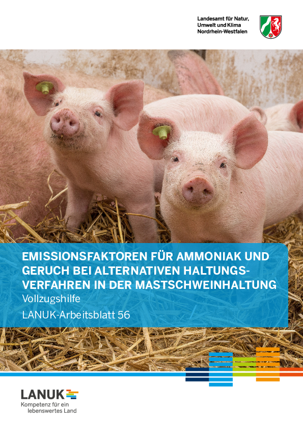 Damit für aktuelle Stallbaumaßnahmen bereits jetzt eine Beurteilung seitens der Genehmigungsbehörden vorgenommen werden kann, hat das LANUK NRW die Vollzugshilfe „Emissionsfaktoren für Ammoniak und Geruch bei alternativen Haltungsverfahren in der Mastschweinehaltung“ erarbeitet, die nun übergangsweise für den Vollzug in NRW bereitgestellt wird, bis die einschlägige VDI-Richtlinie bundeseinheitlich fortgeschrieben wurde.
