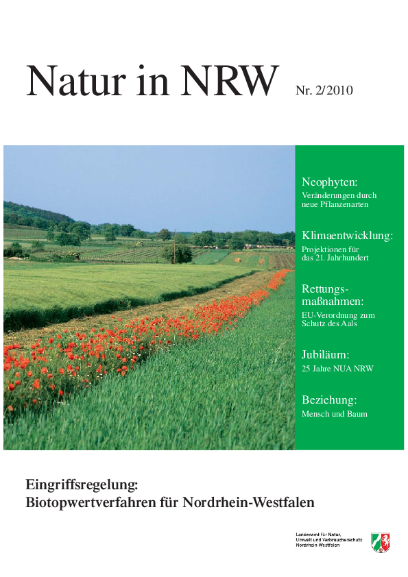 Die aktuelle Ausgabe von Natur in NRW stellt als Titelthema das im Landesamt für Natur, Umwelt und Verbraucherschutz NRW (LANUV) entwickelte Biotopwertverfahren vor. Das seit 2009 für den Straßenbau verpflichtende Verfahren setzt die Vorgaben der Eingriffsregelung in eine Biotoptypenliste mit Wertvorschlägen um.