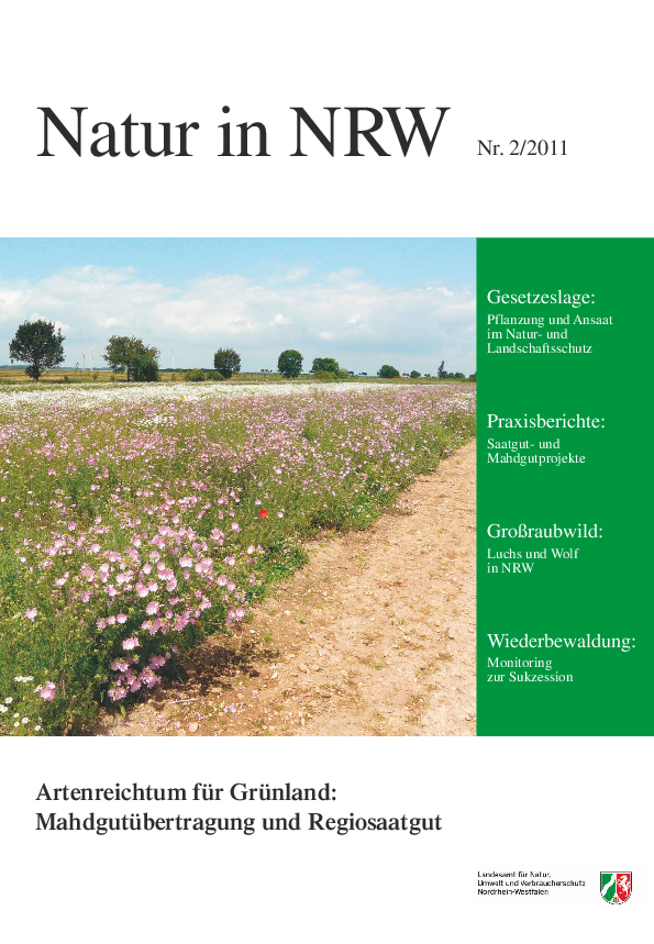 Thematischer Schwerpunkt der vorliegenden Ausgabe von Natur in NRW ist der Schutz und die Entwicklung artenreichen Grünlands. Bei Maßnahmen des Naturschutzes sowie im Straßen- und Deichbau kommt es aufgrund mangelnden Angebotes regionalen Wildpflanzensaatgutes oder aus fehlender Kenntnis noch häufig zu Ansaaten mit nicht gebietsheimischen Arten oder Unterarten, zum Teil sogar mit züchterisch veränderten Sorten. Mahdgutübertragung aus artenreichen Spenderflächen sowie Ausbringung regionalen Saatgutes aus speziellen Regiosaatgutprojekten sollen diese Form der Florenverfälschung zukünftig deutlich verringern helfen. Das vom LANUV entwickelte Fachinformationssystem Mahdgutübertragung kann mit seinem Spenderflächenkataster einen wichtigen Beitrag dazu leisten.