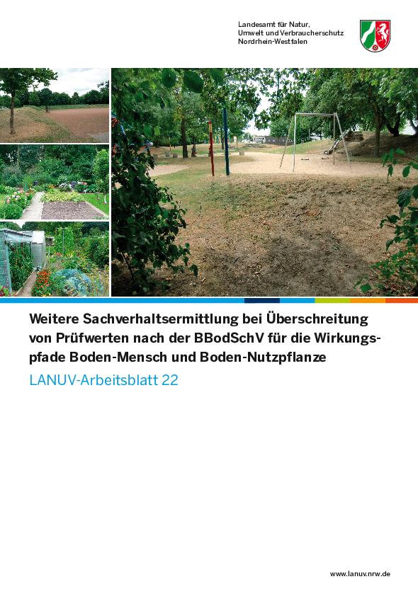Das Arbeitsblatt 22 wurde durch die LABO-Arbeitshilfe Expositionsabschätzung in der Detailuntersuchung ersetzt. Es bleibt jedoch weiterhin online zugänglich, weil es über die LABO-Arbeitshilfe hinausgehende Informationen z. B. zur Schadstoffaufnahme über den Wirkungspfad Boden-Nutzpflanze (Garten-Modell) sowie zum Humanbiomonitoring enthält.