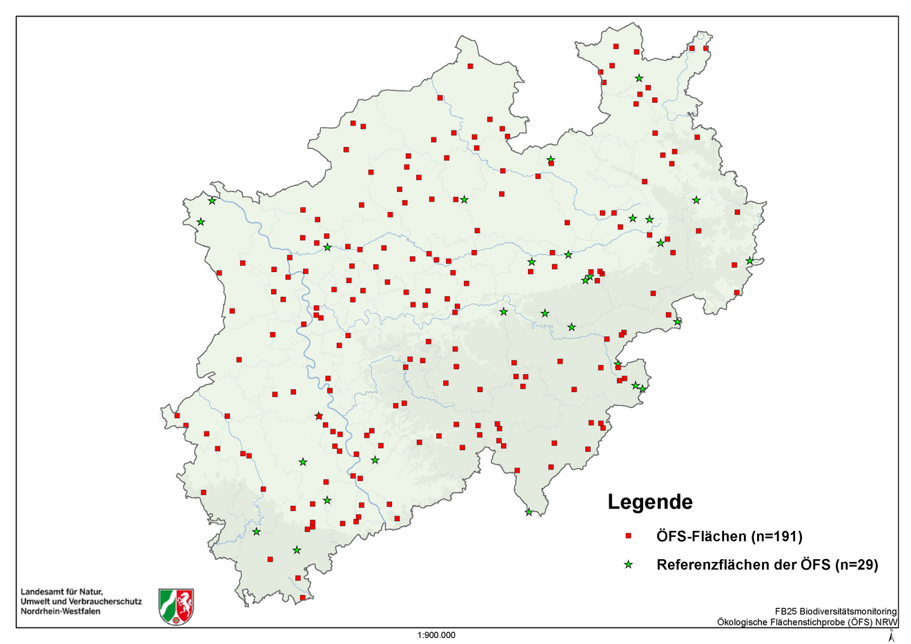 Die Ökologische Flächenstichprobe (ÖFS) ist zentraler Baustein des Biodiversitätsmonitorings NRW. Sie basiert auf einem repräsentativen Netz von 191 zufällig ausgewählten Untersuchungsflächen mit einer Größe von je 100 Hektar. Das entspricht einem Anteil von 0,5% der Landesfläche. Als Vergleichsflächen dienen weitere 29, ebenfalls 100 Hektar große sogenannte Referenzflächen in Naturschutzvorranggebieten.