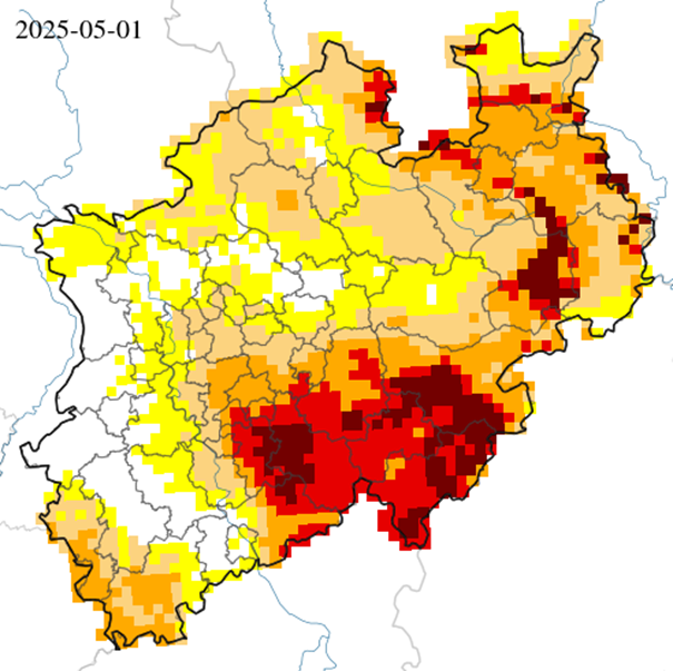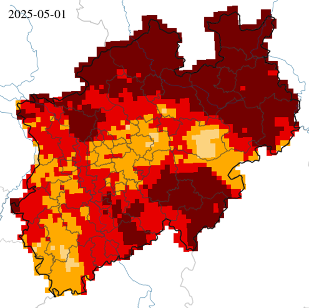 Im April teils außergewöhnliche Dürre im Oberboden und zunehmende Dürreerscheinungen im Gesamtboden in NRW.