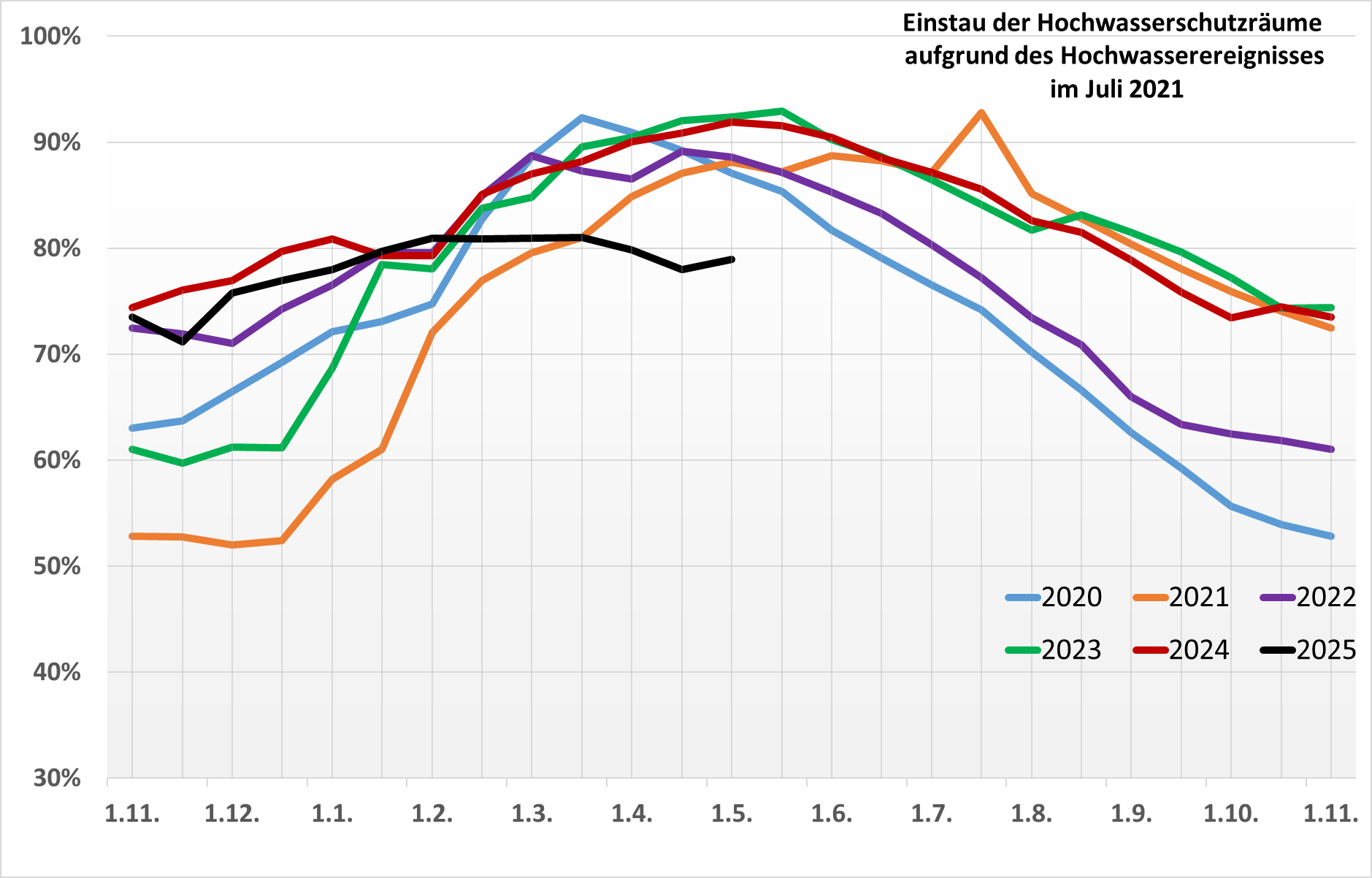 (*Von Februar bis April werden die Hochwasserrückhalteräume, welche wegen der im Winter erhöhten Hochwassergefahr vorgehalten werden müssen, an vielen Talsperren in NRW schrittweise wieder reduziert. Dies geschieht um ab Beginn der Schichtung in den Talsperren im Frühjahr, Wasser ausreichender Menge und Qualität für den benötigten Bedarf (Trinkwasser, Niedrigwasseraufhöhung etc.) im Frühjahr und Sommer bereitstellen zu können.)