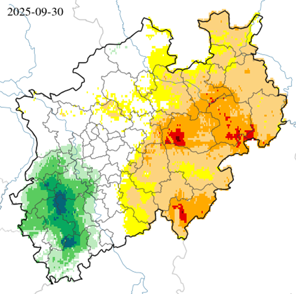 Im September in der Osthälfte von NRW hauptsächlich Dürreausprägungen mit Jährlichkeiten von 5 Jahren, in der Westhälfte von NRW nahezu keine Dürre.