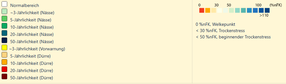 Der UFZ-Dürremonitor trifft keine Aussage über das absolut im Boden verfügbare Wasser. Eine Aussage über die resultierende Grundwasserneubildung kann daraus nicht abgeleitet werden.
