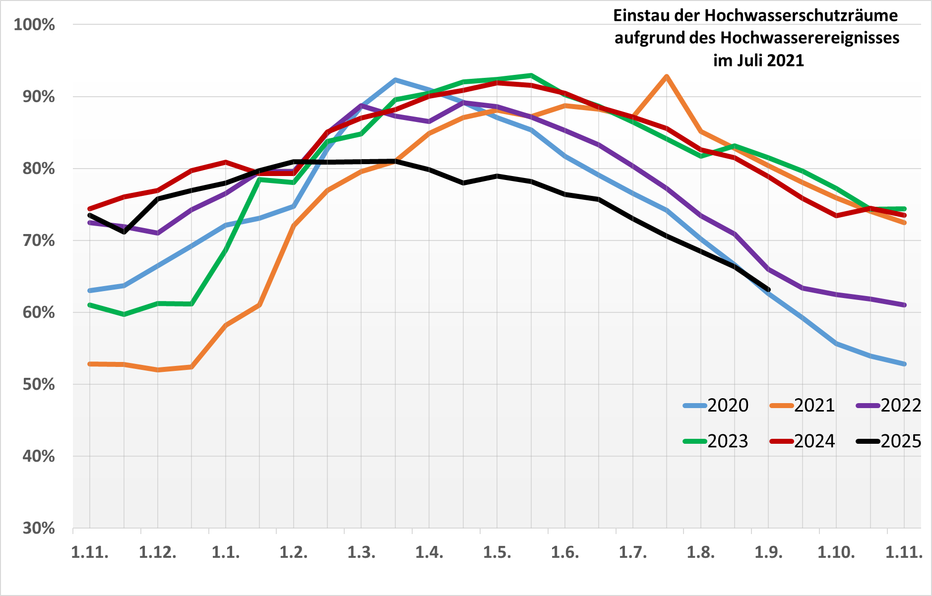 (*Von Februar bis September werden die Hochwasserrückhalteräume, welche wegen der im Winter erhöhten Hochwassergefahr vorgehalten werden müssen, an vielen Talsperren in NRW schrittweise wieder reduziert. Dies geschieht um ab Beginn der Schichtung in den Talsperren im Frühjahr, Wasser in ausreichender Menge und Qualität für den benötigten Bedarf (Trinkwasser, Niedrigwasseraufhöhung etc.) im Frühjahr und Sommer bereitstellen zu können.)